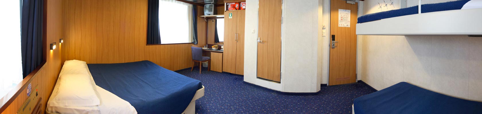 Cabine quadruple intérieure sans hublot Cabine pont supérieur avec 4 couchages et salle de bains avec douche, sans hublot. (C4)